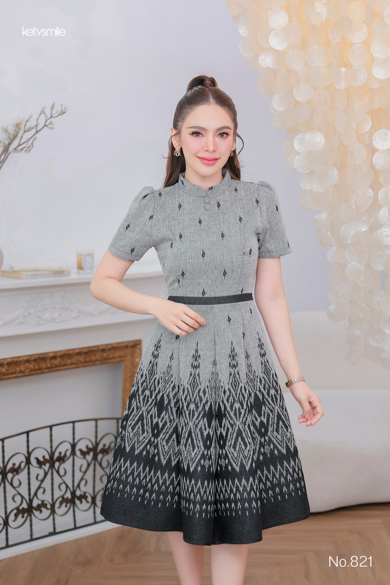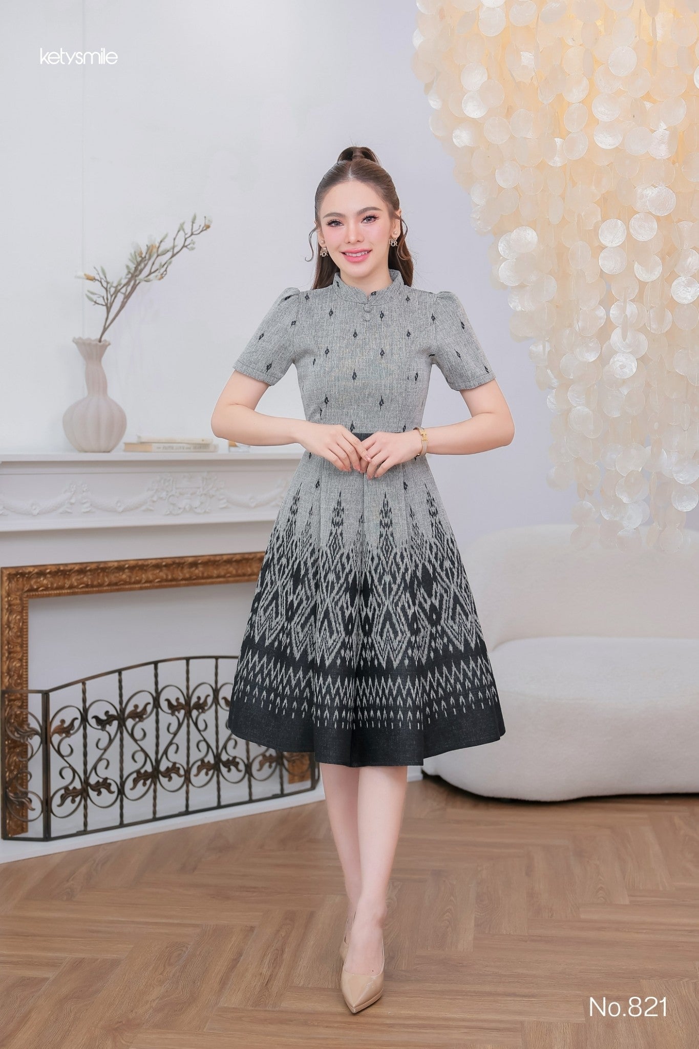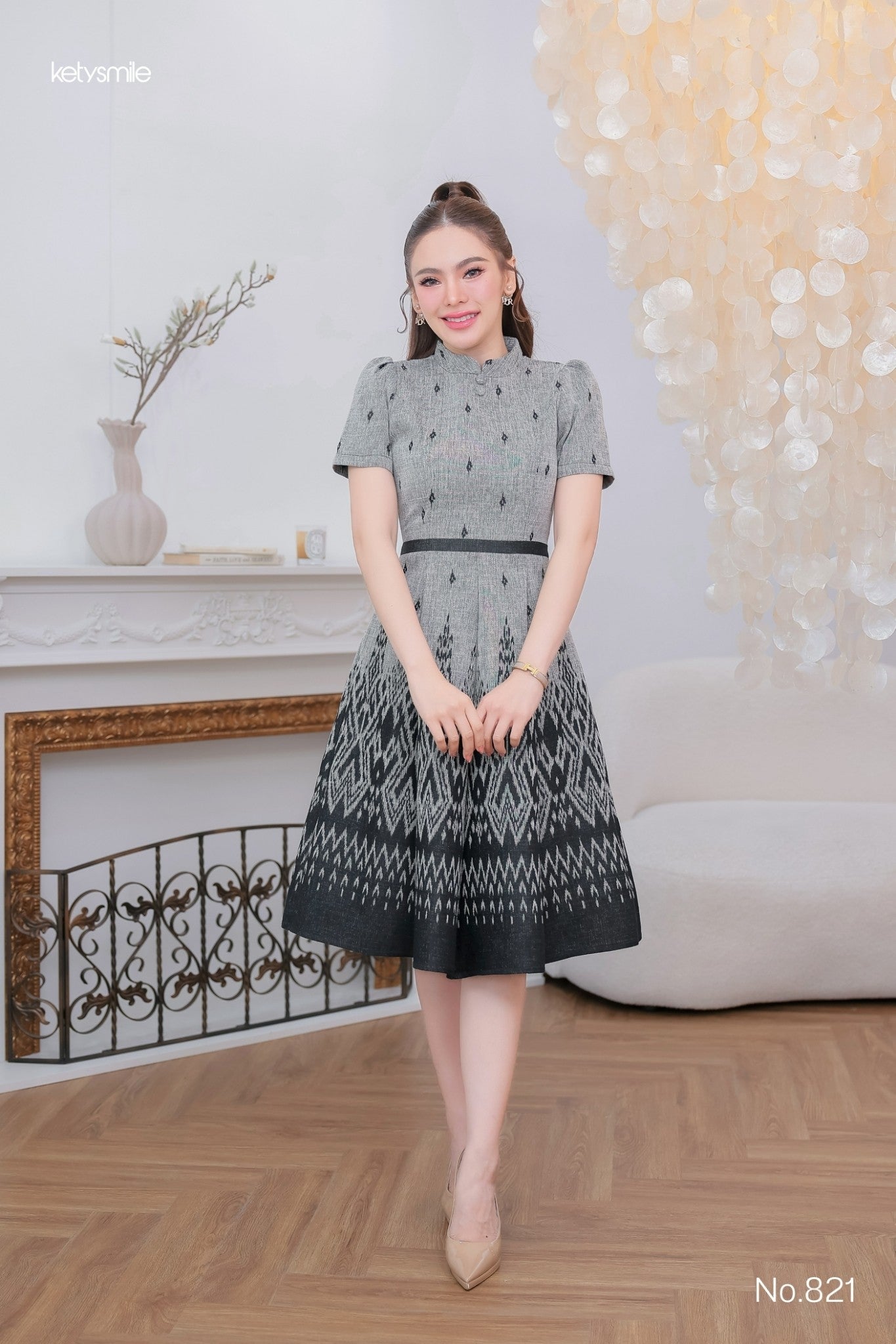 💗 ชุดเดรสผ้าทอลาย คอปีน แต่งขอบเอว กระโปรงบาน 8 ชิ้น อัดกาวทั้งชุดชิ้น ซิปซ่อนด้านหลัง 💗