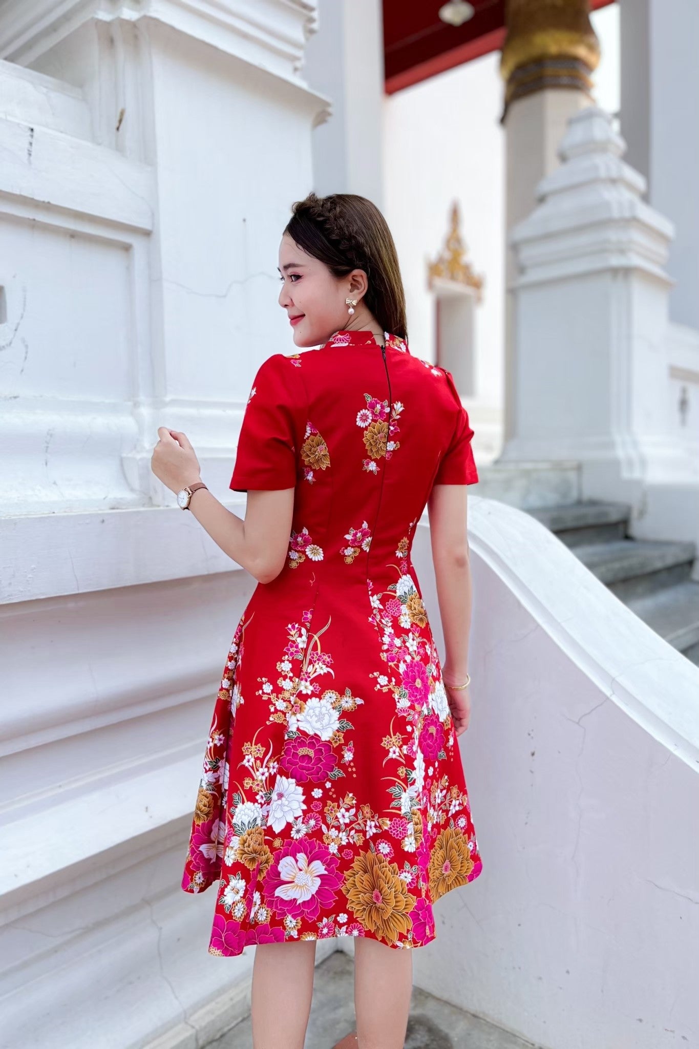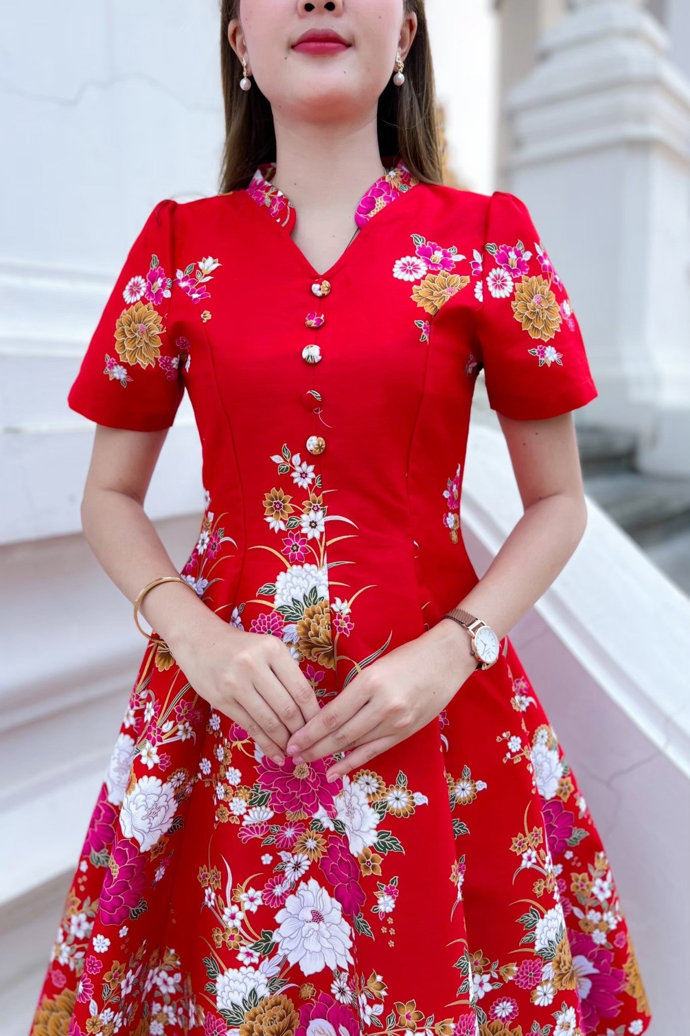 ชุดเดรสผ้าปาเต๊ะกิโมโน คอจีน แต่งกระดุมปั๊ม กระโปรงบาน 8 ชิ้น งานอัดกาว ทั้งชุด ทุกชิ้น ซิปซ่อนด้านหลัง สีแดง