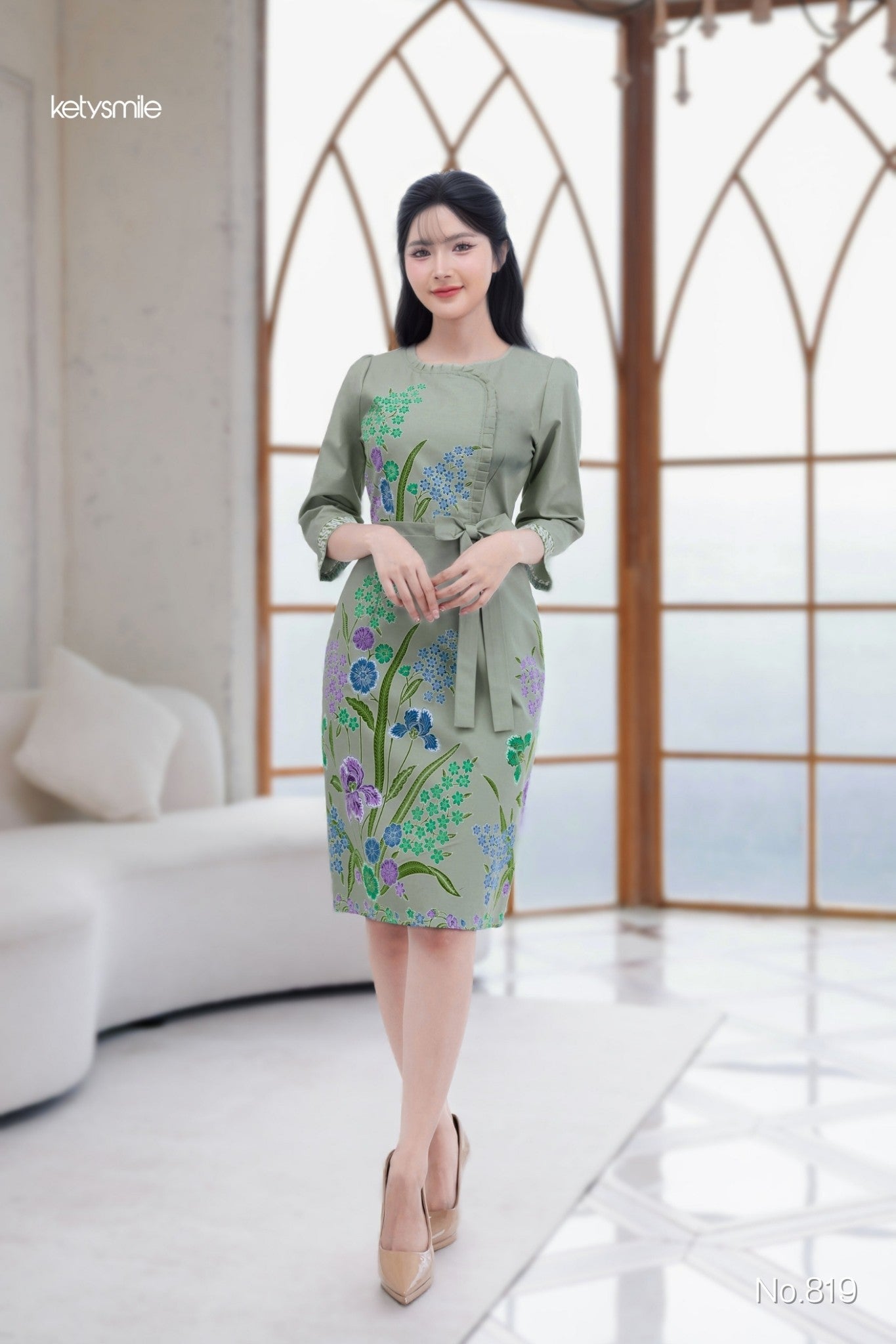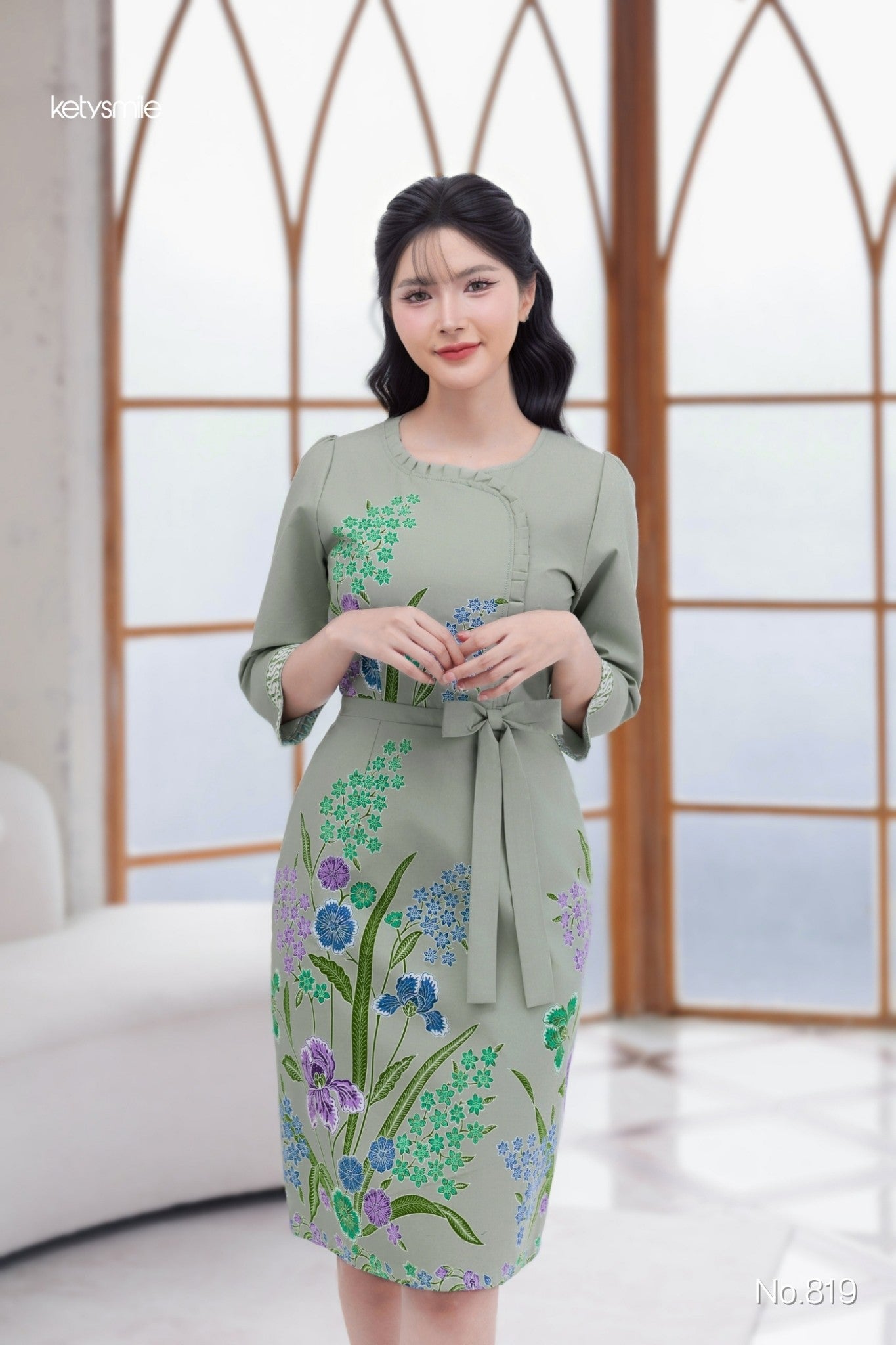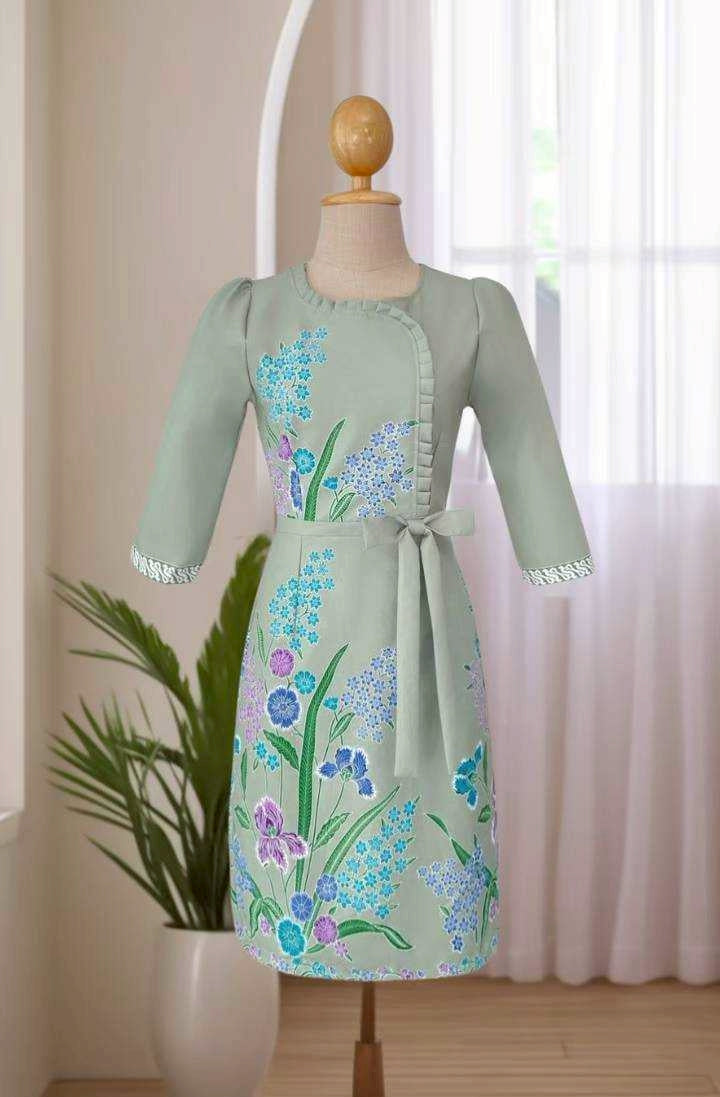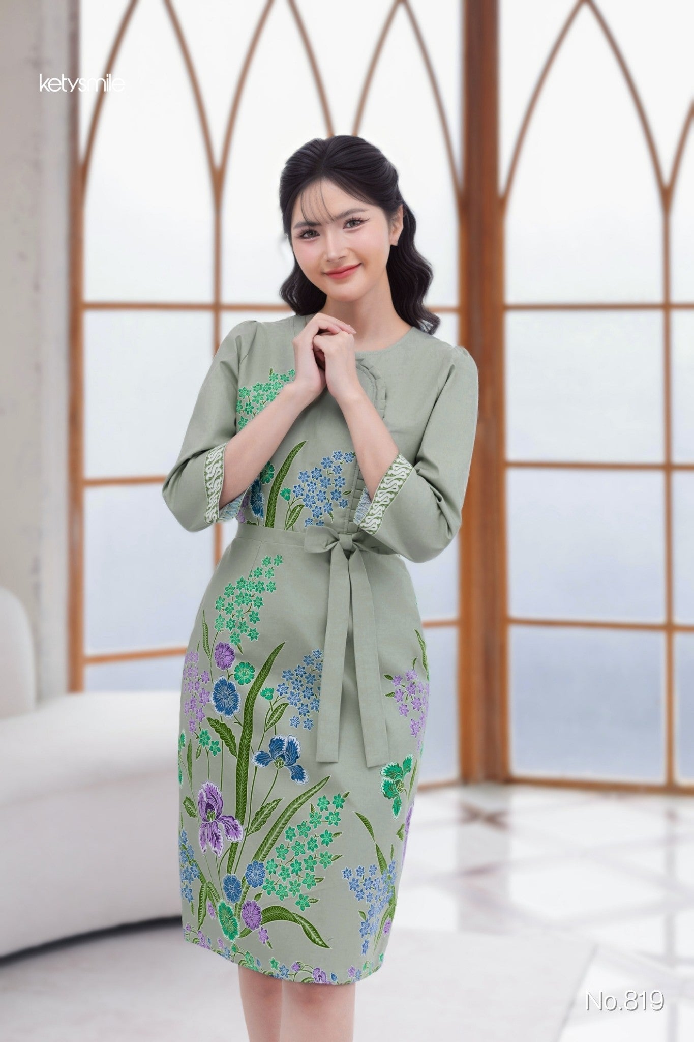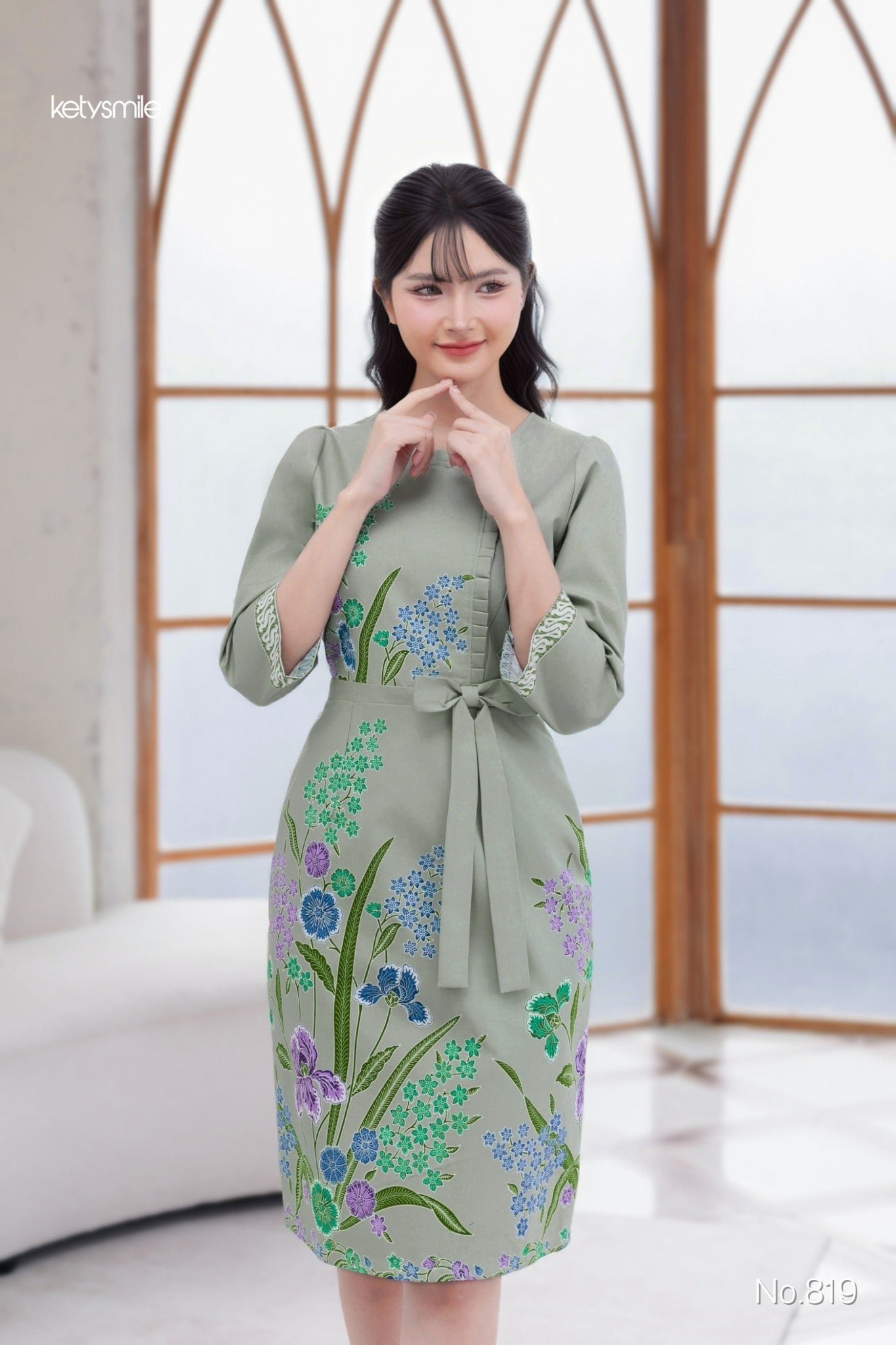 ชุดเดรสผ้าปาเต๊ะลายดอกกล้วยไม้ แขนศอกระบายอก แต่งโบว์ งานอัดกาวทั้งชุด ทุกชิ้น ซิปซ่อนด้านหลัง สีเขียว